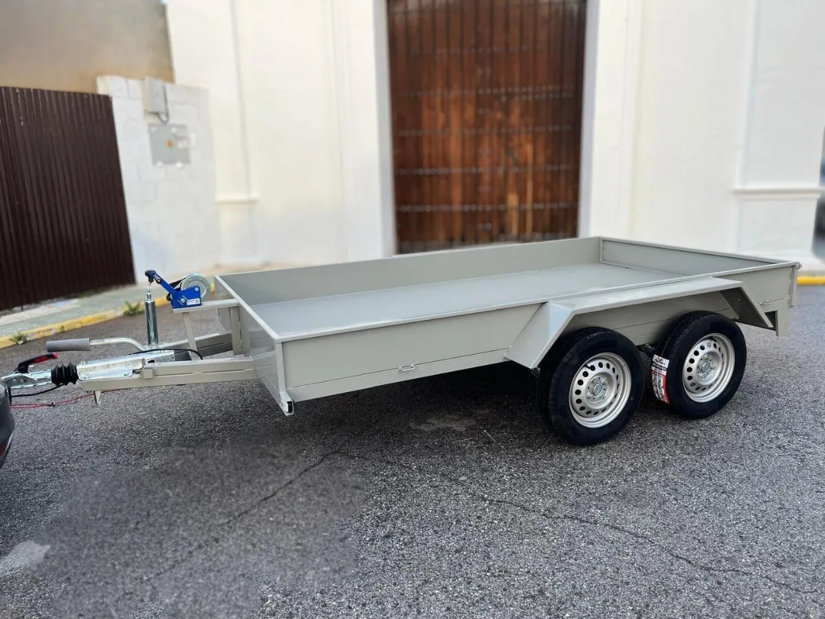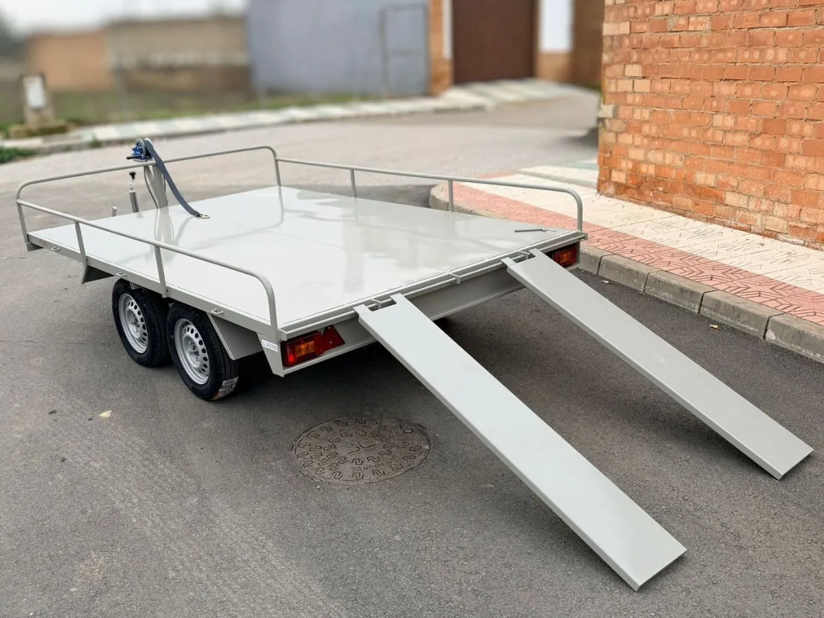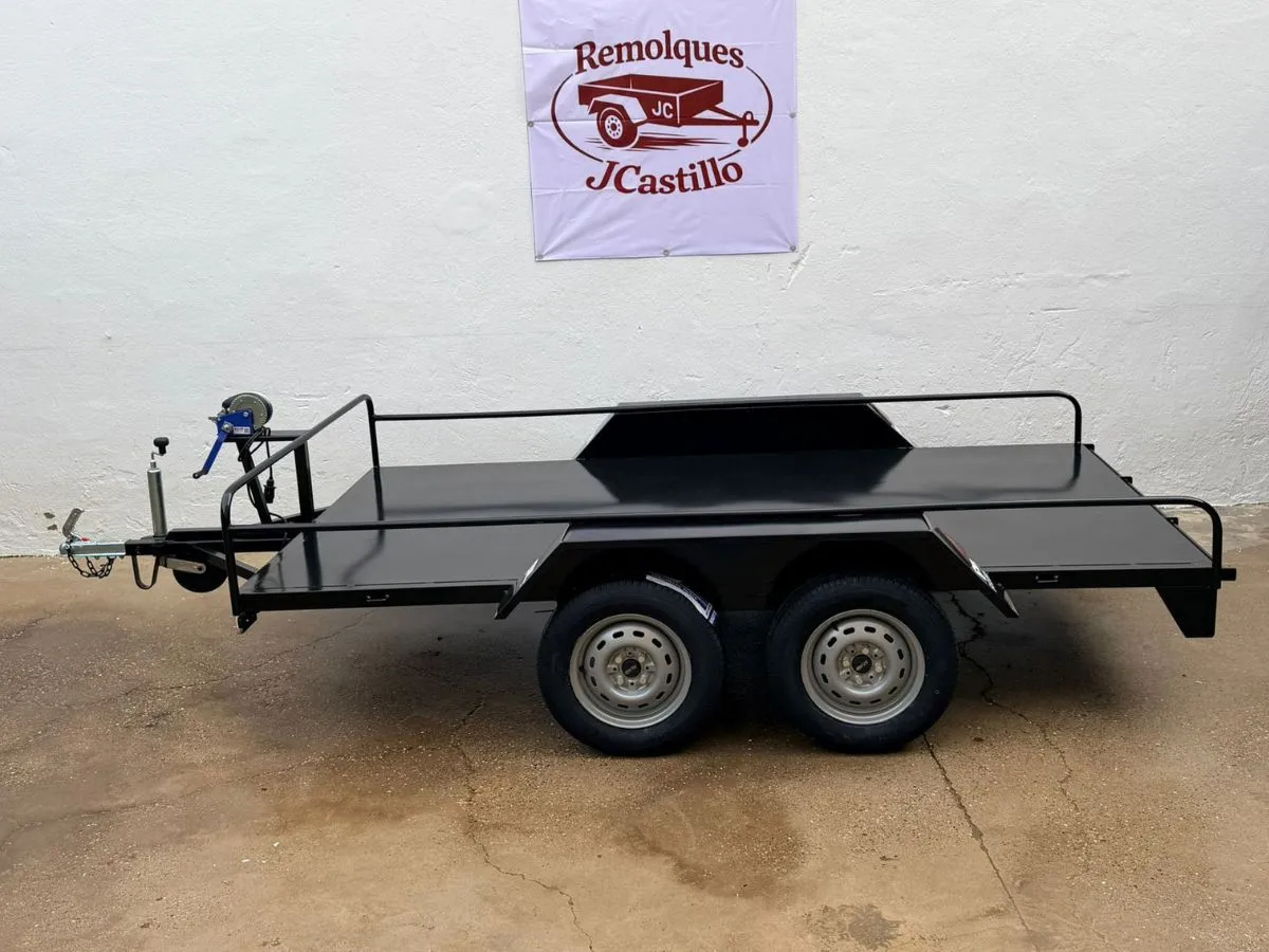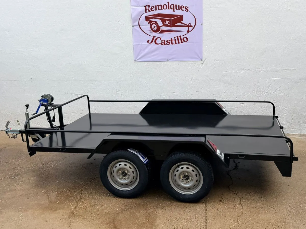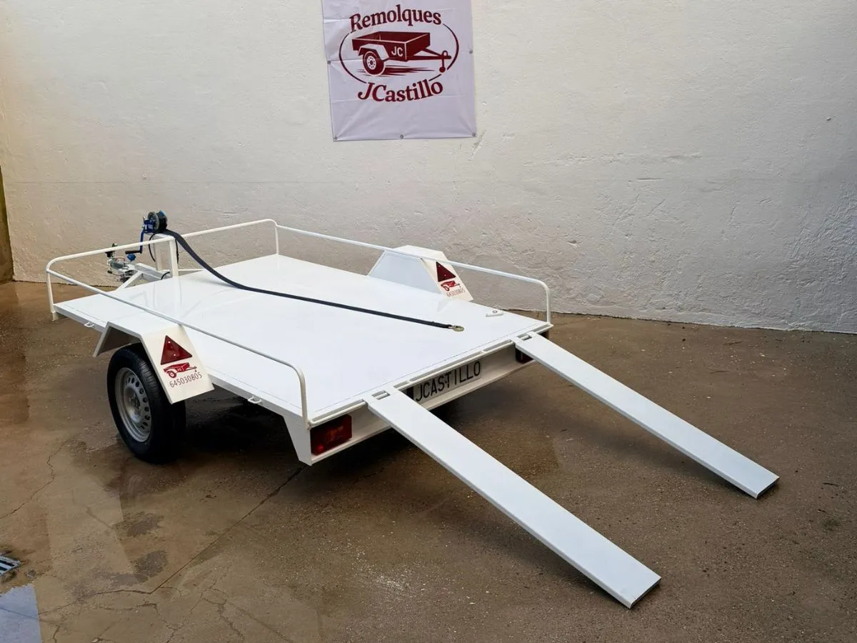 Vendemos remolques plataformas homologados para transportar motos, quads, buggy, carruajes, coches de caballo, maratón, jardinera, aperos, mini tractores, etc…con rampa de carga, con 1 o 2 ejes, con o sin freno, con o sin tableros. Para uso profesional y particular.