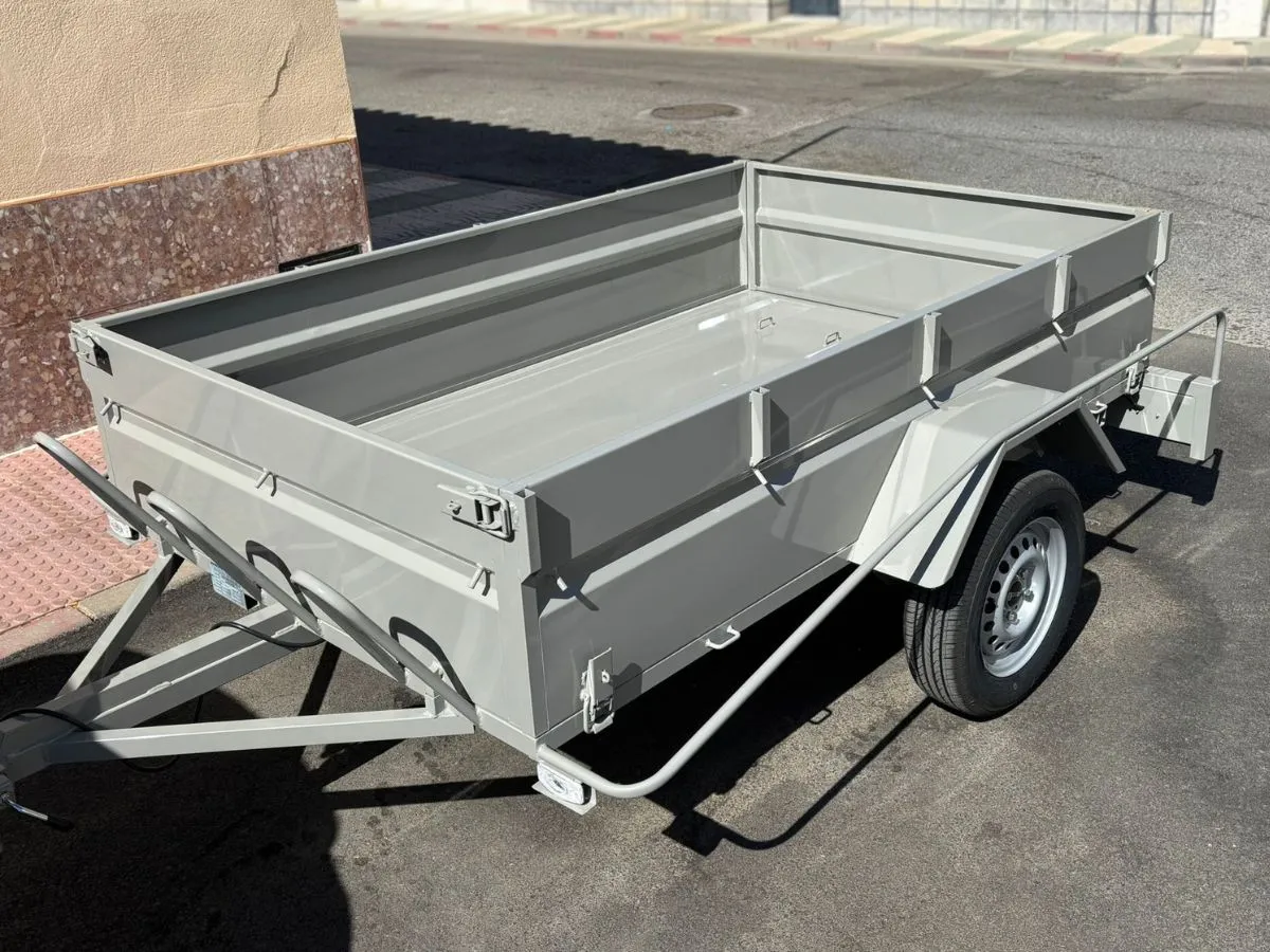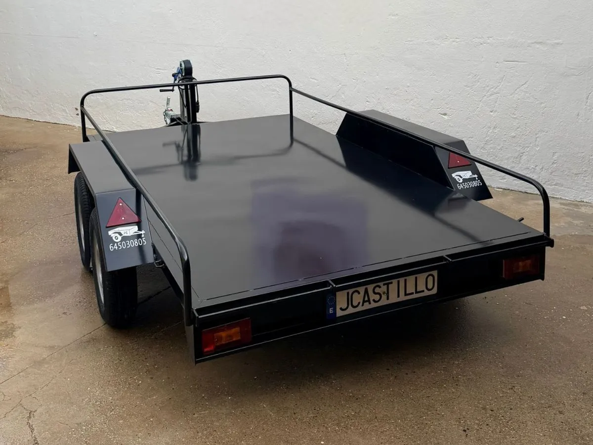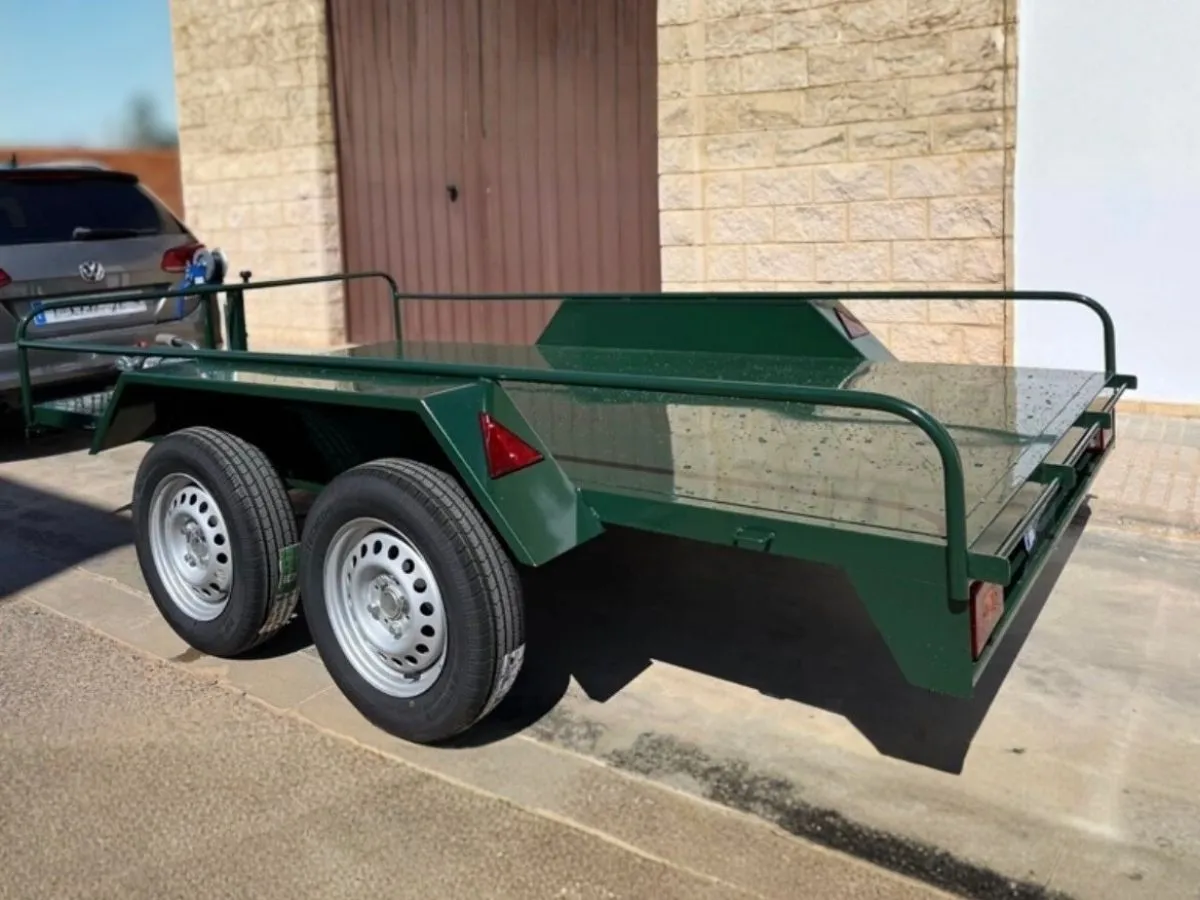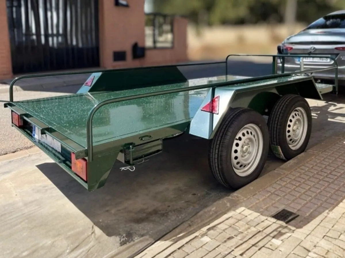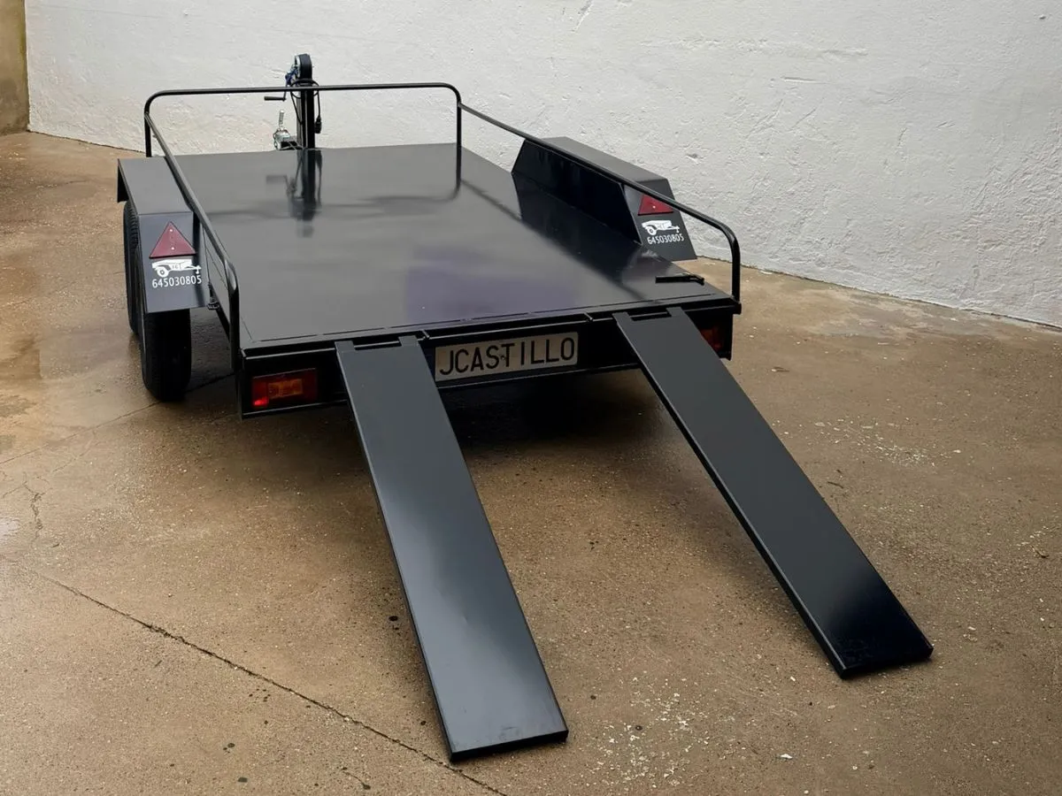 Vendemos remolques plataformas homologados para transportar motos, quads, buggy, carruajes, coches de caballo, maratón, jardinera, aperos, mini tractores, etc…con rampa de carga, con 1 o 2 ejes, con o sin freno, con o sin tableros. Para uso profesional y particular.