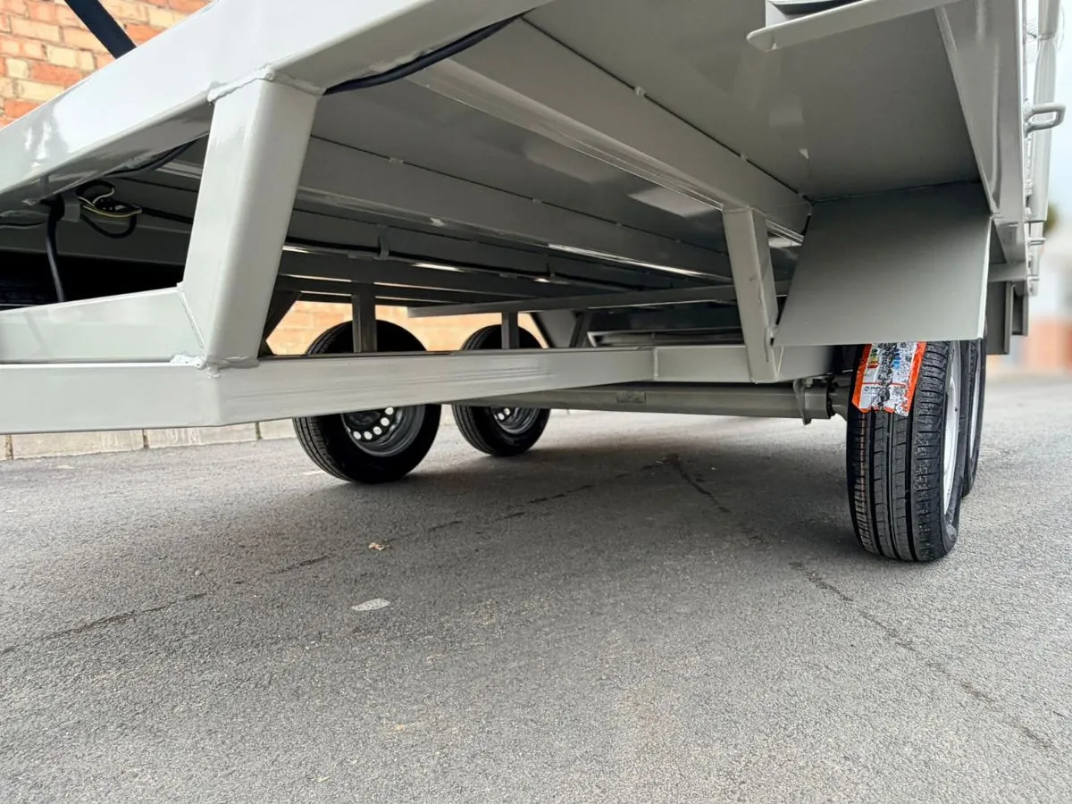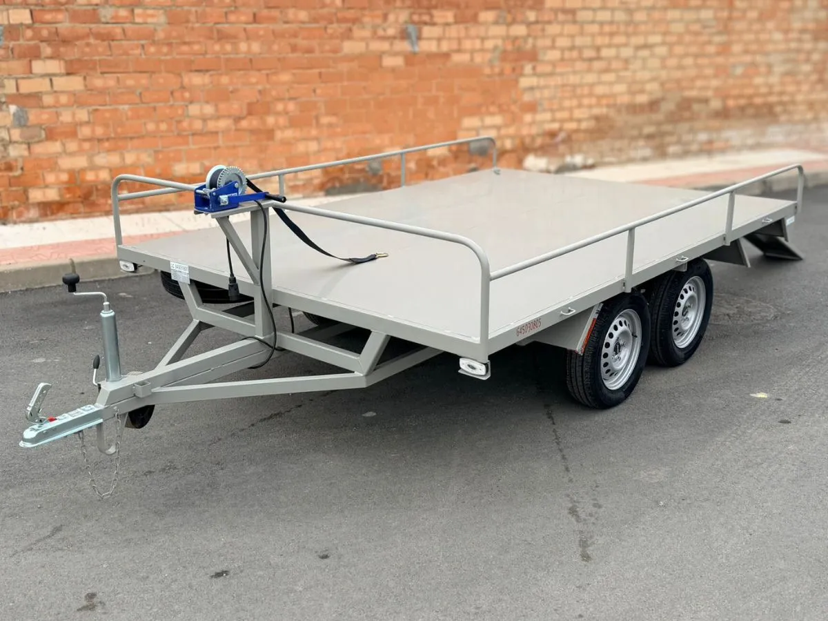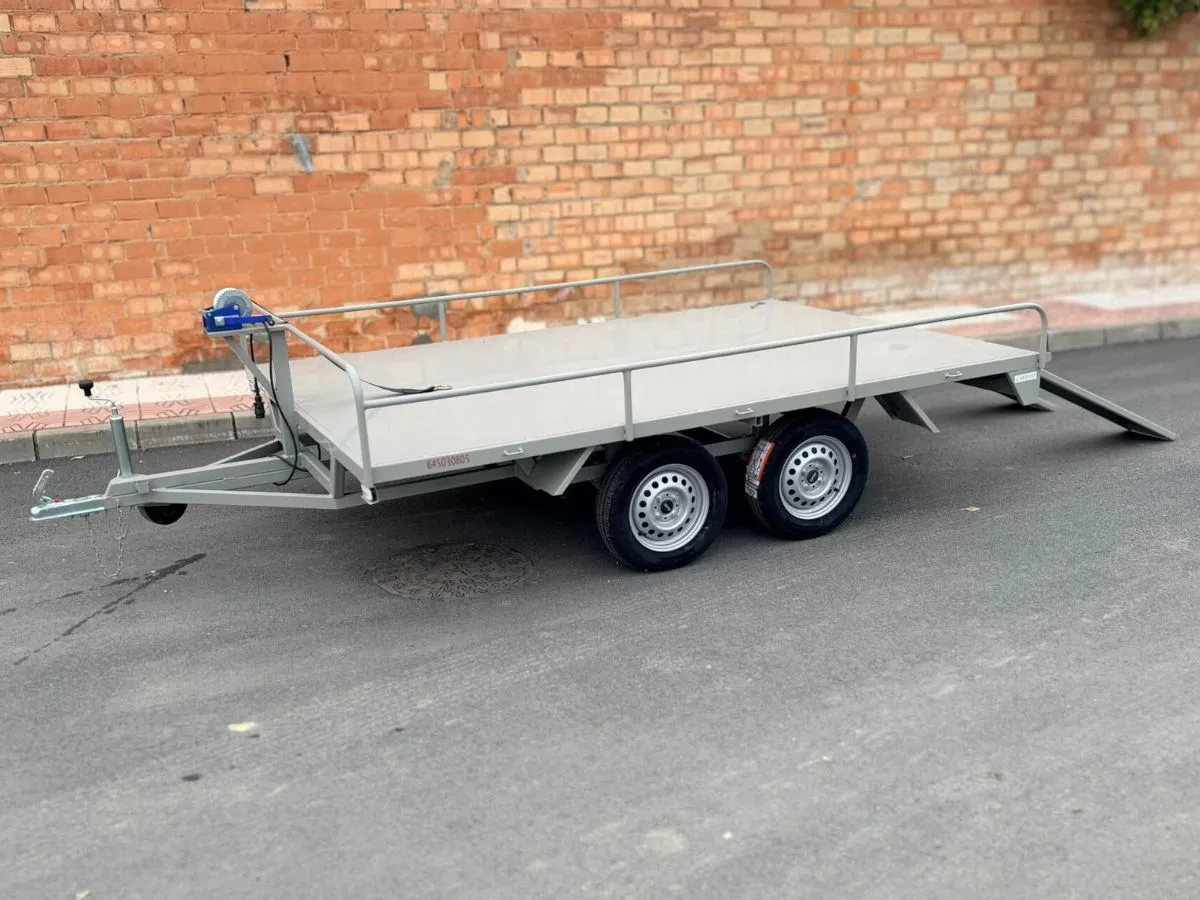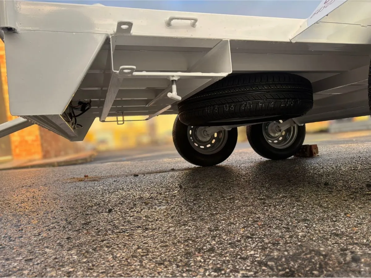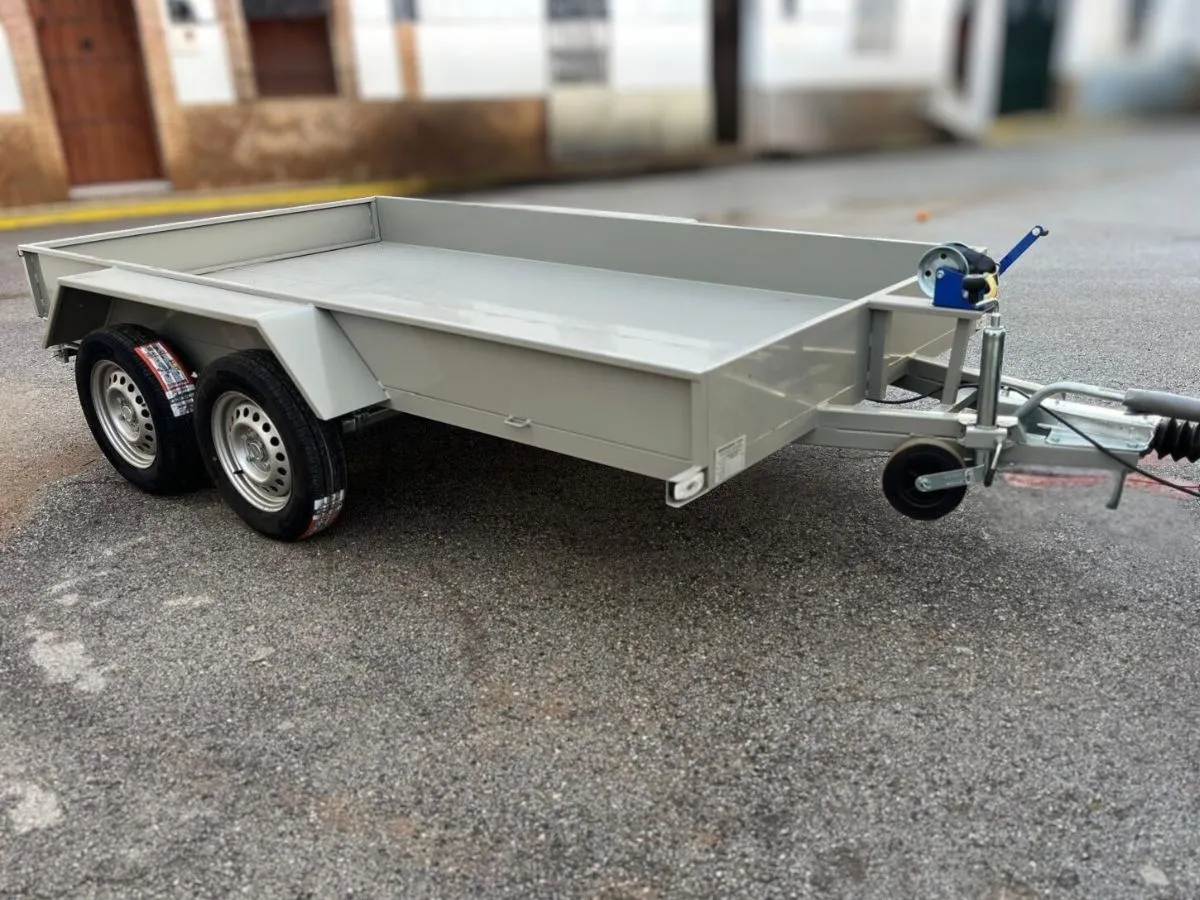 Plataforma batea ideal para transportar materiales pesados y vehículos. Remolque ligero que se puede llevar con carnet de coche. Rueda de repuesto y rueda jockey incluidas.