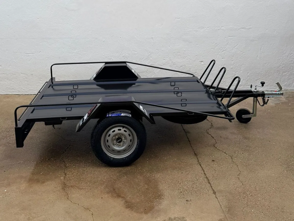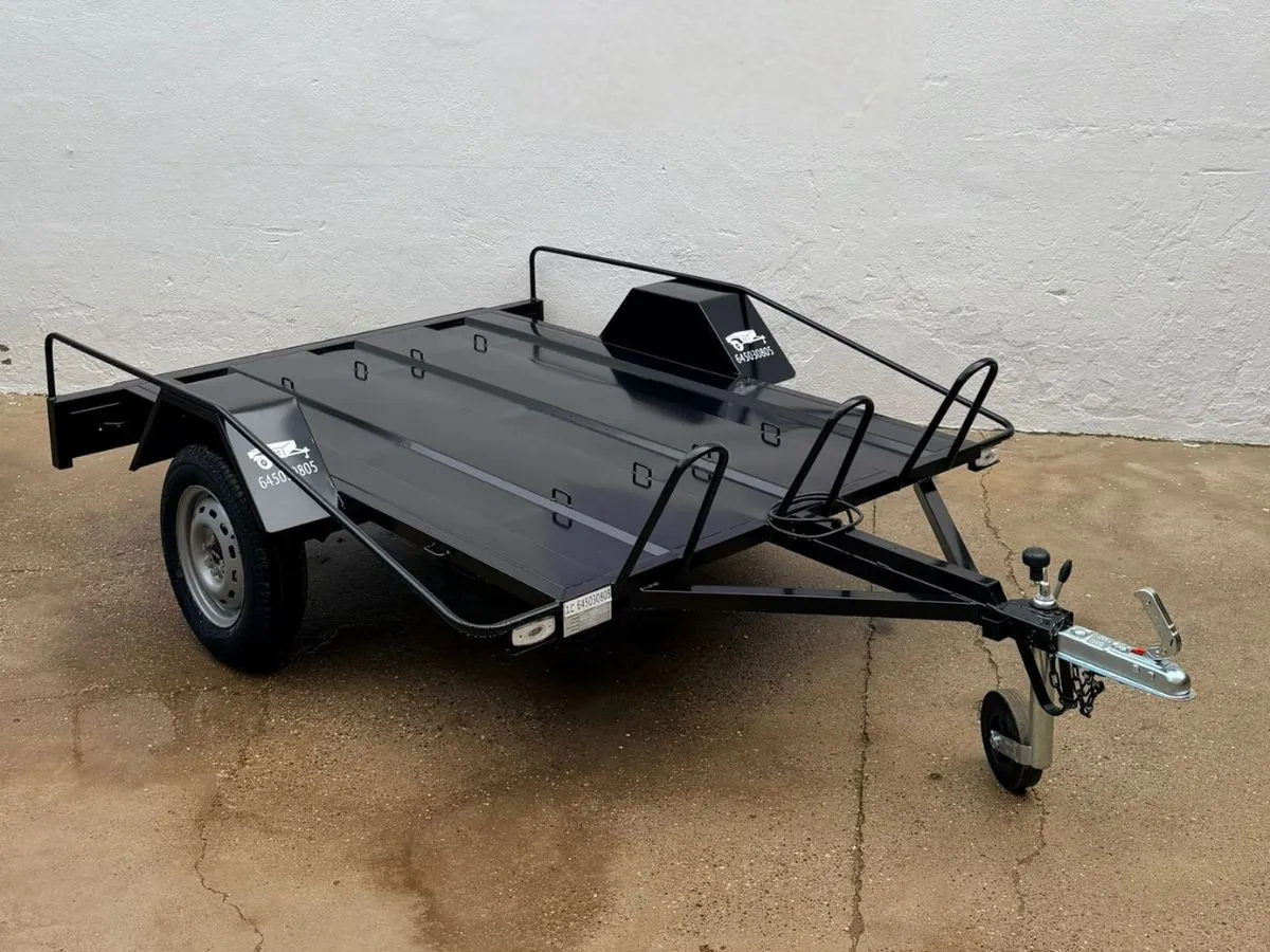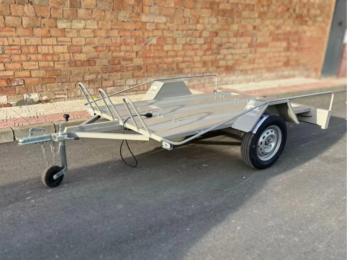 Remolque plataforma ideal para transportar cómodamente hasta 3 motos grandes y usarlo también para llevar otros enseres gracias a sus tableros desmontables. Remolque ligero 750kg. Rueda de repuesto y rueda jockey incluidas.