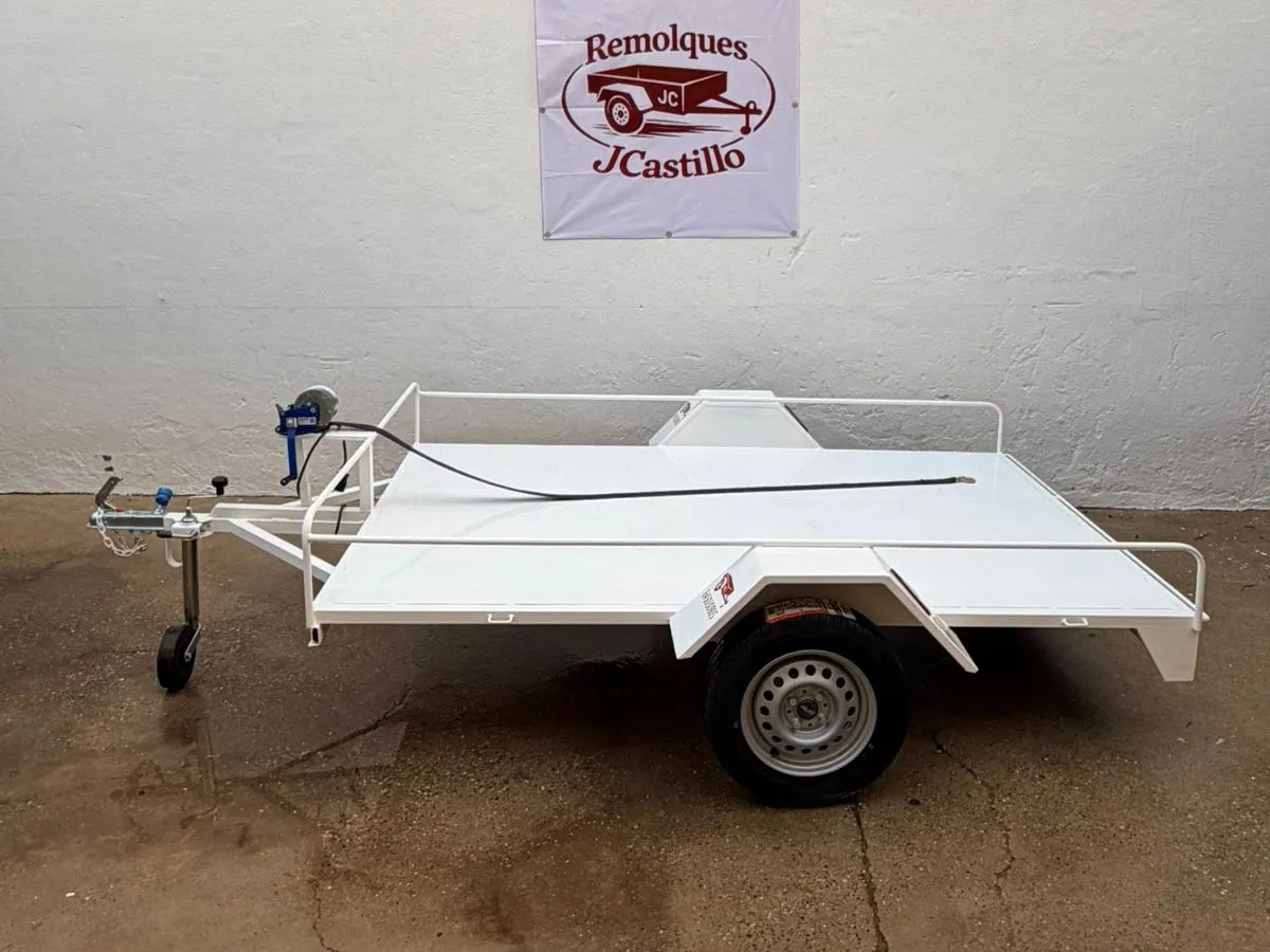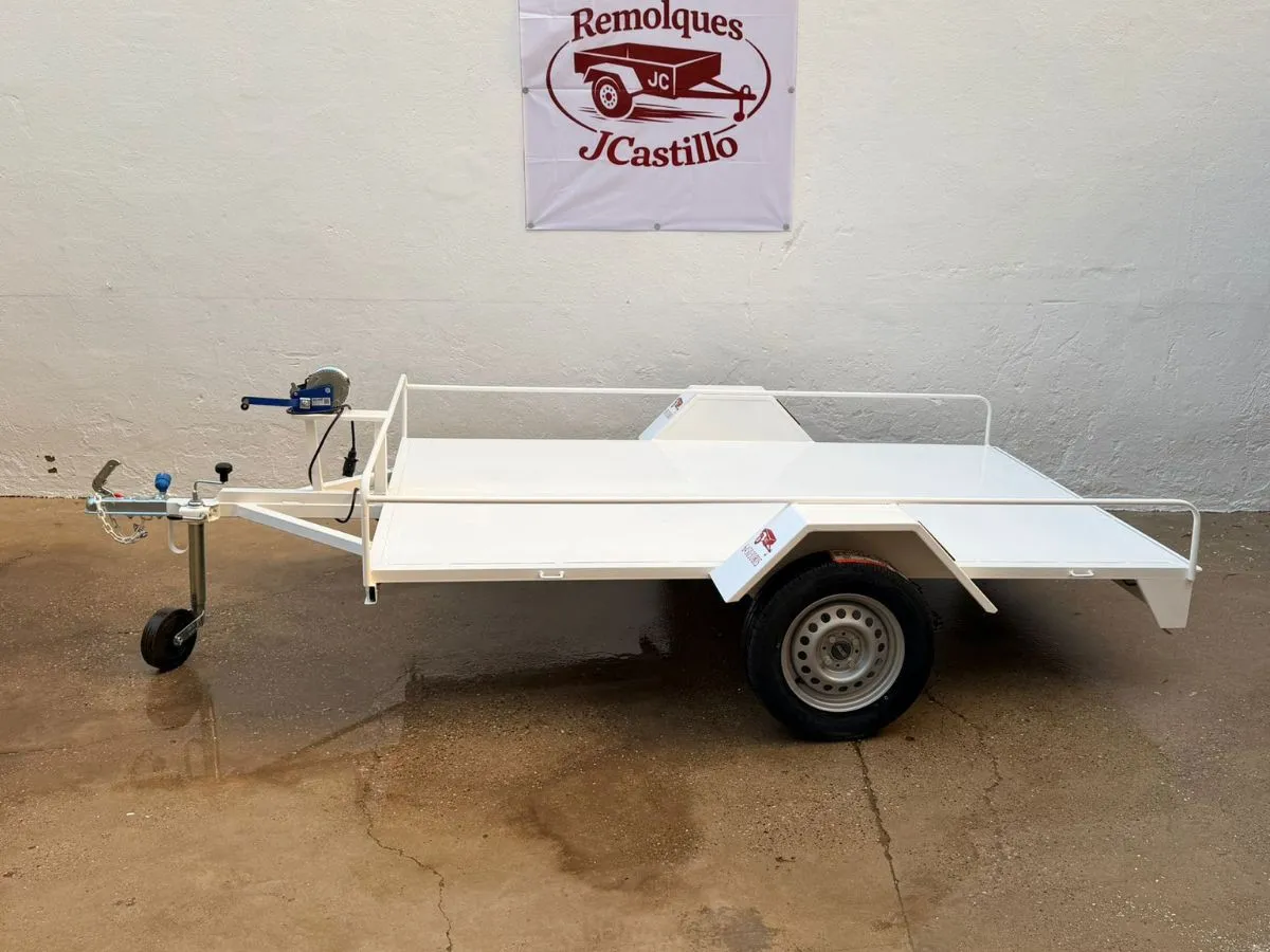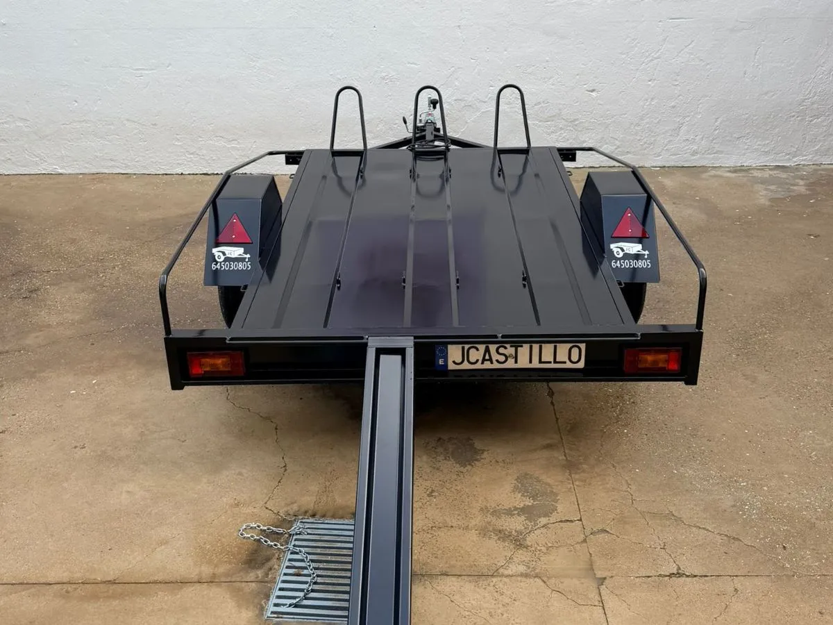 Remolque plataforma ideal para transportar cómodamente hasta 3 motos grandes. Remolque ligero que se puede llevar con carnet de coche. Rueda de repuesto y rueda jockey incluidas.
