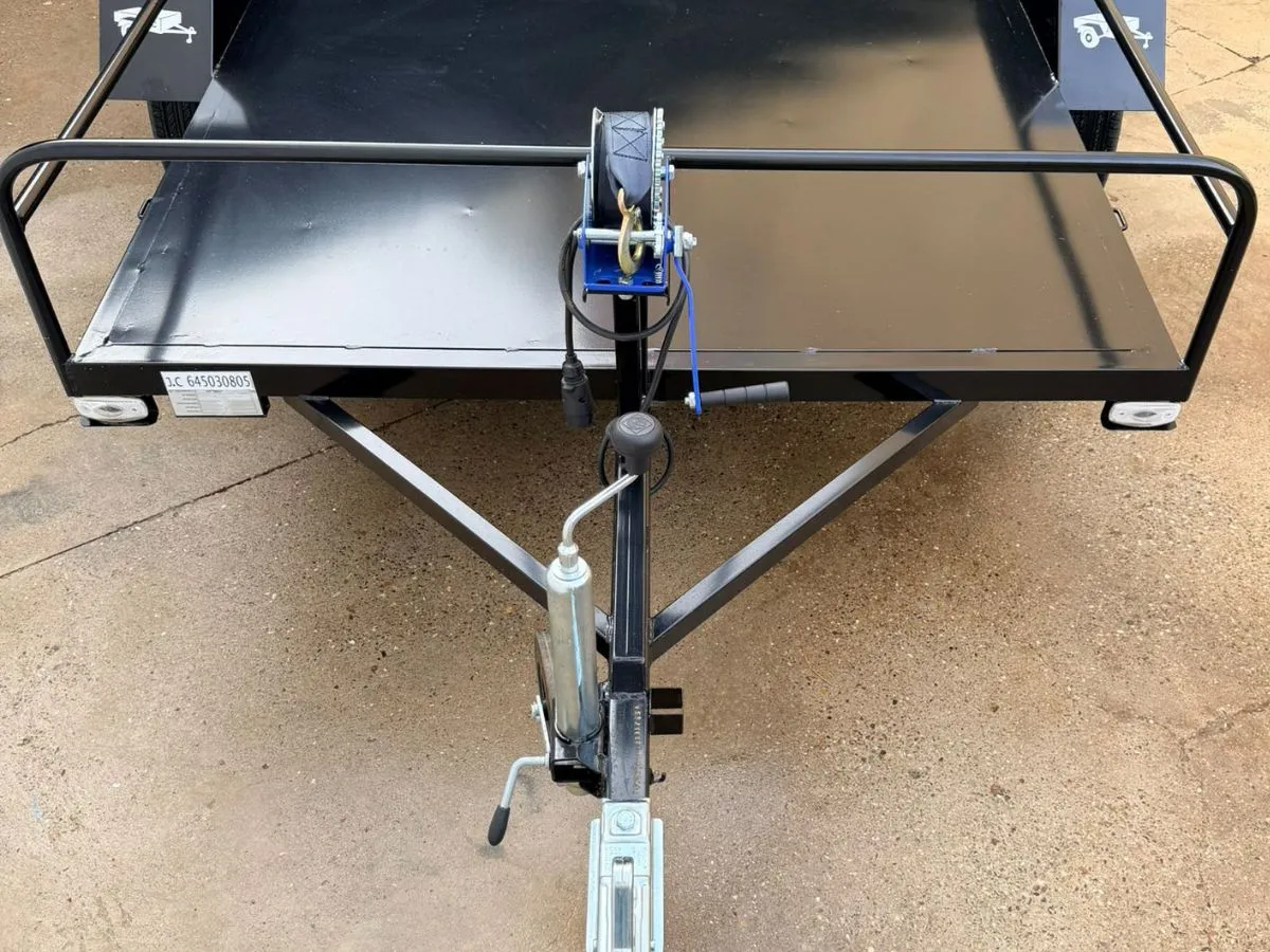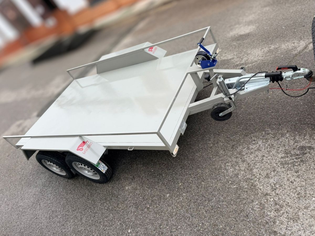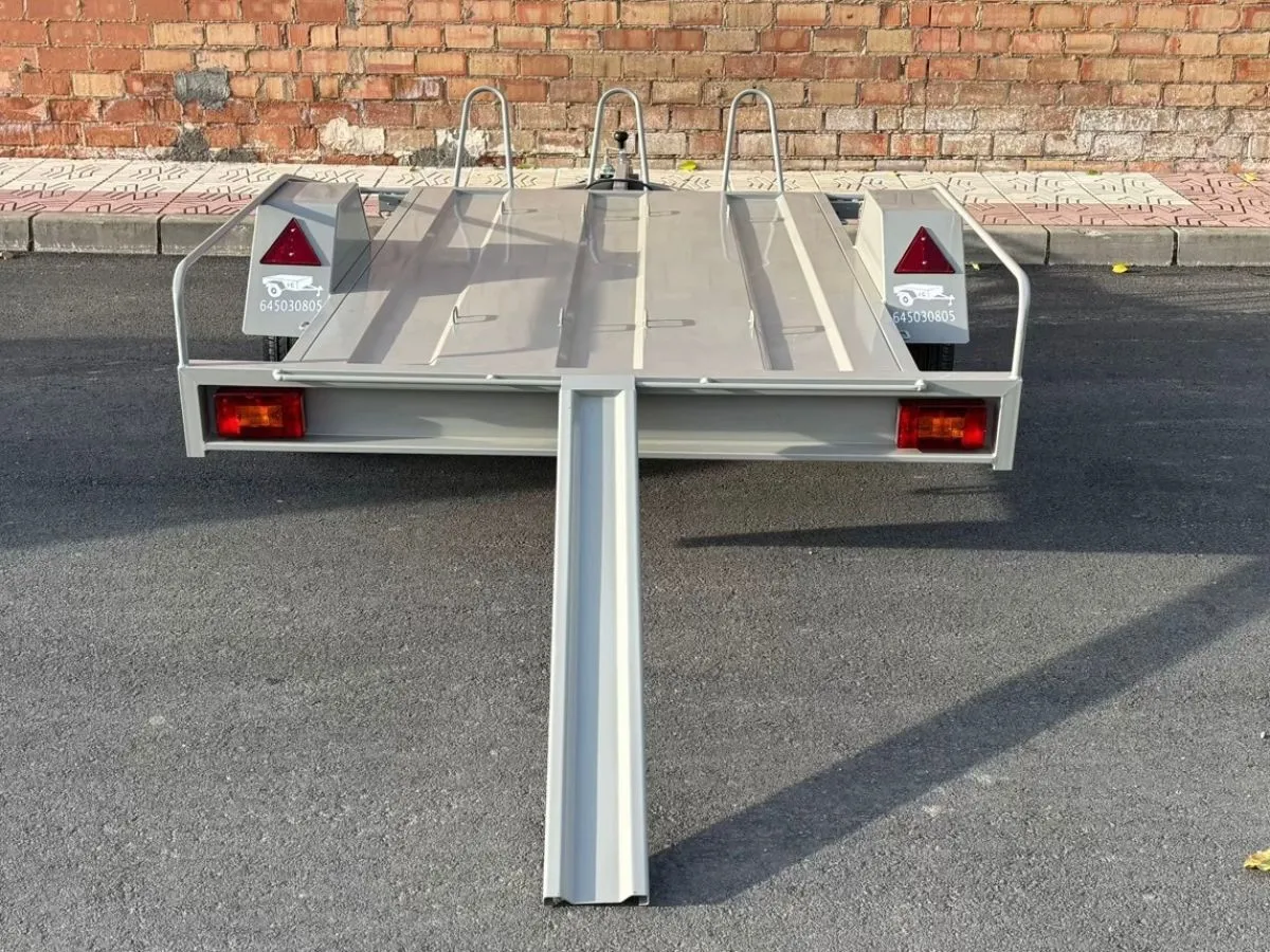 Remolque plataforma ideal para transportar cómodamente hasta 3 motos grandes. Remolque ligero que se puede llevar con carnet de coche. Rueda de repuesto y rueda jockey incluidas.